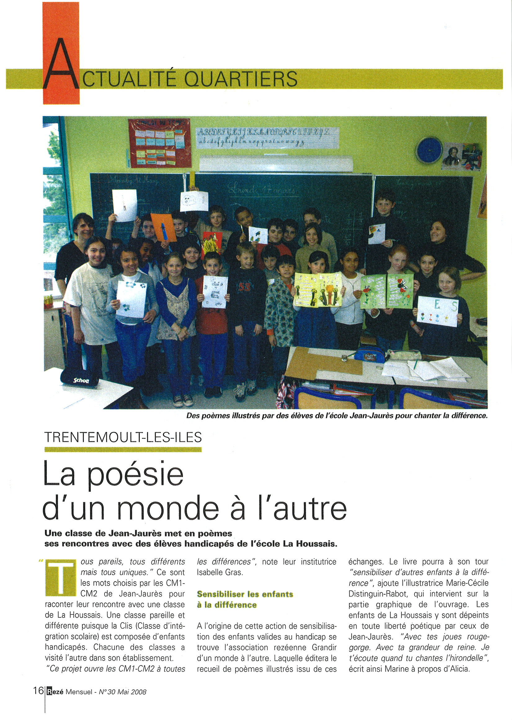 Ce recueil de poésie, fruit de la rencontre entre deux classes de Rezé en Loire-Atlantique, une CLasse d'Intégration Scolaire et une classe de primaire (CM1-CM2,) révèle une des façons dont la différence en général et le handicap en particulier peut s'écrire et se dessiner.