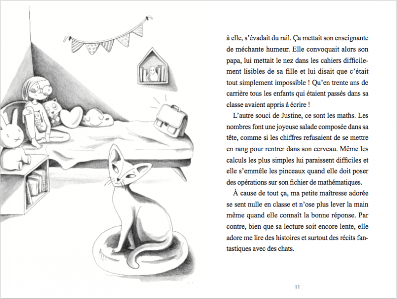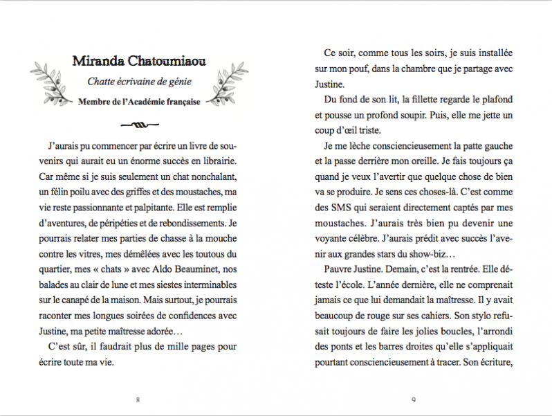 L'histoire est racontée par Miranda Chatoumiou une chatte qui se trouve géniale, exceptionnelle et très spéciale ! Miranda est la confidente de Justine, sa petite maîtresse adorée. La fillette lui confie ses difficultés à l’école, les remarques de son enseignante sur sa lenteur et les moqueries qu’elle subit parce qu’elle est dyspraxique. A l’approche de la rentrée scolaire, Justine est triste. Heureusement, le jour J, elle fait la connaissance d’Abi, une nouvelle élève...